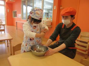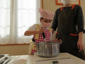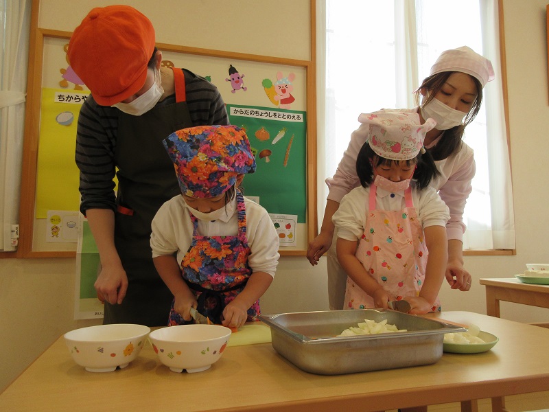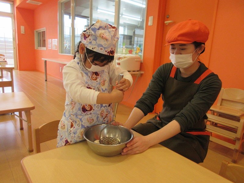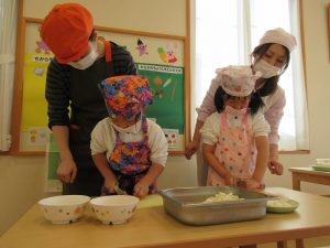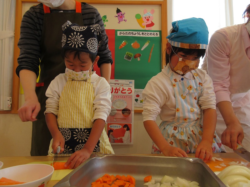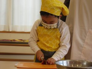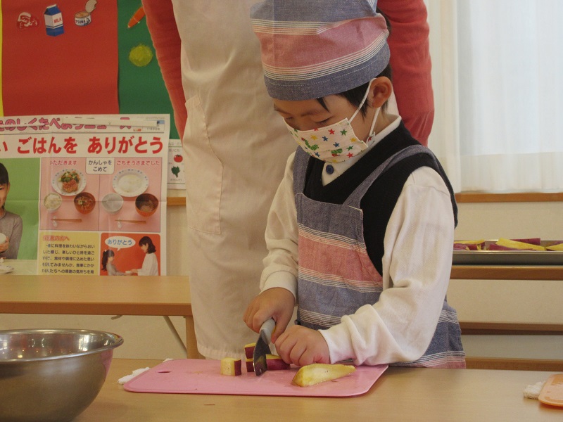 さつまいもを切って、「さつまいものシチュー」を作ってもらいました。ゆっくり、ゆっくり。ちょっぴり硬かったけど、最後まで切れたね。