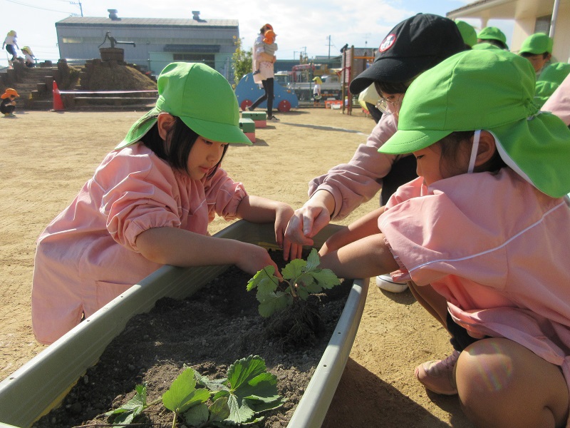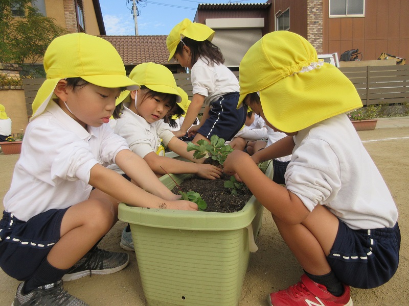 いちごの苗植えをしました。「いちごにお布団をかけてあげよう」と、優しく土をかぶせていました。水やりも張り切ってしています。