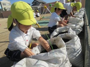 玉ねぎを植えました。給食で食べるのが楽しみだね!