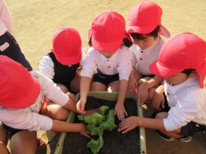 「大きくなあれ」と願いをこめて、レタスや白菜の苗を植えました。