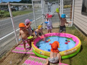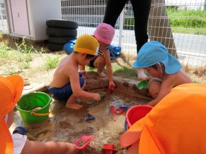 暑さに負けず元気いっぱい水遊びや泥遊びを楽しんでいます♪