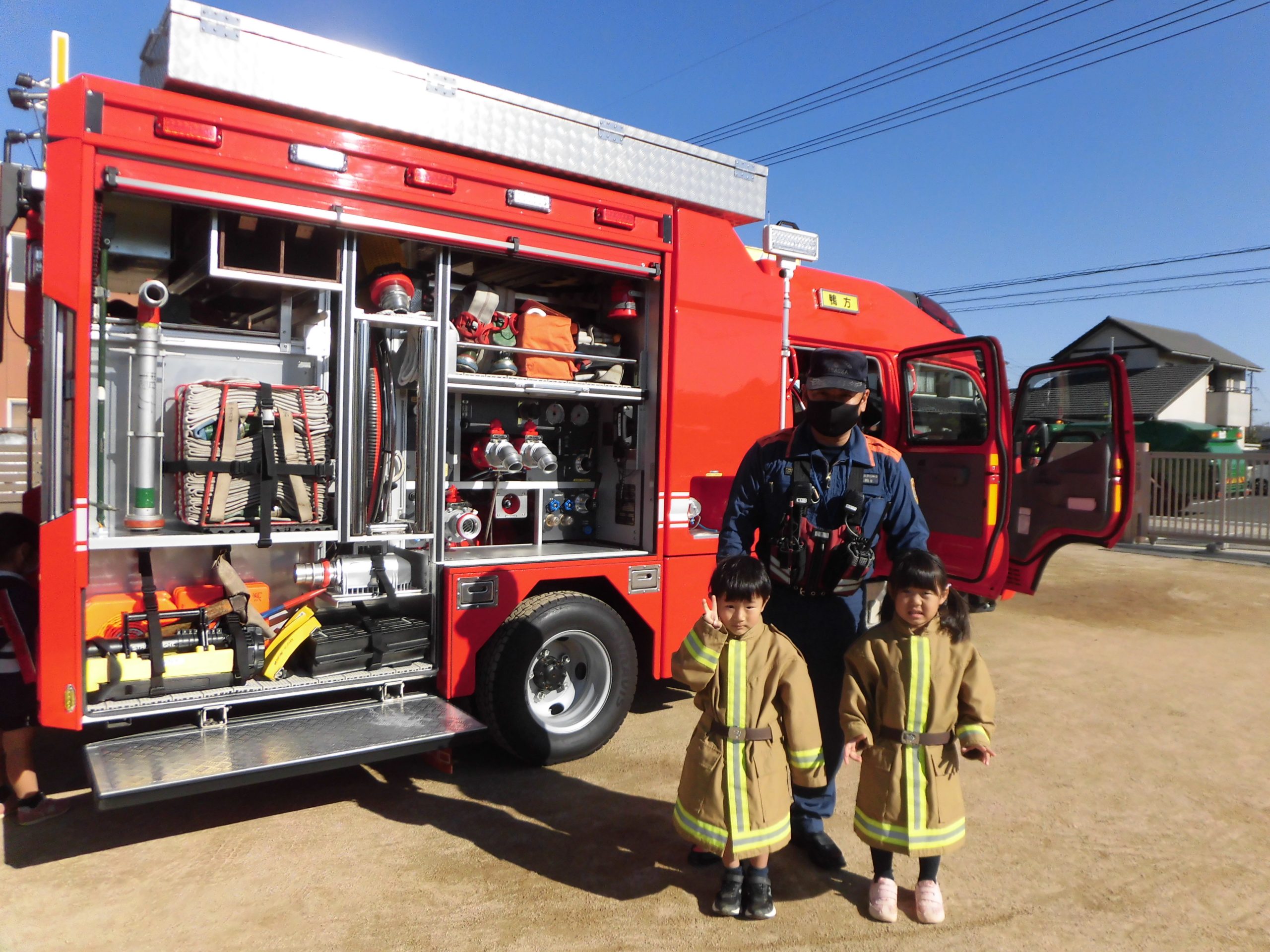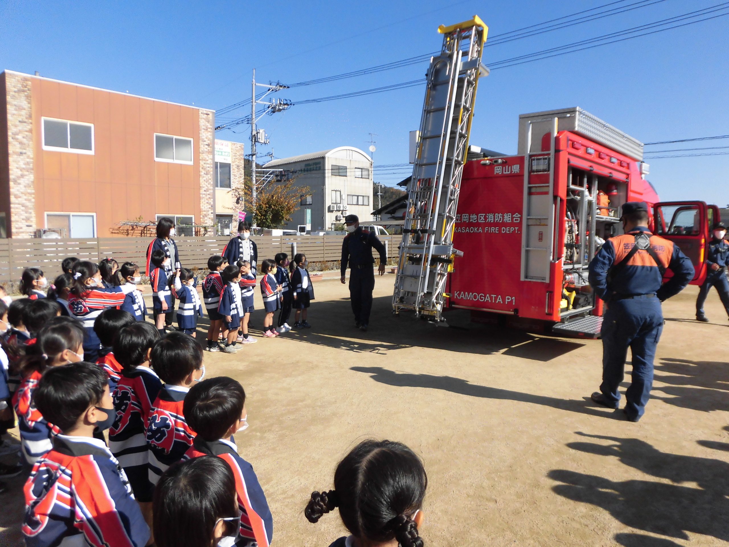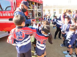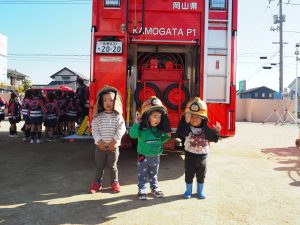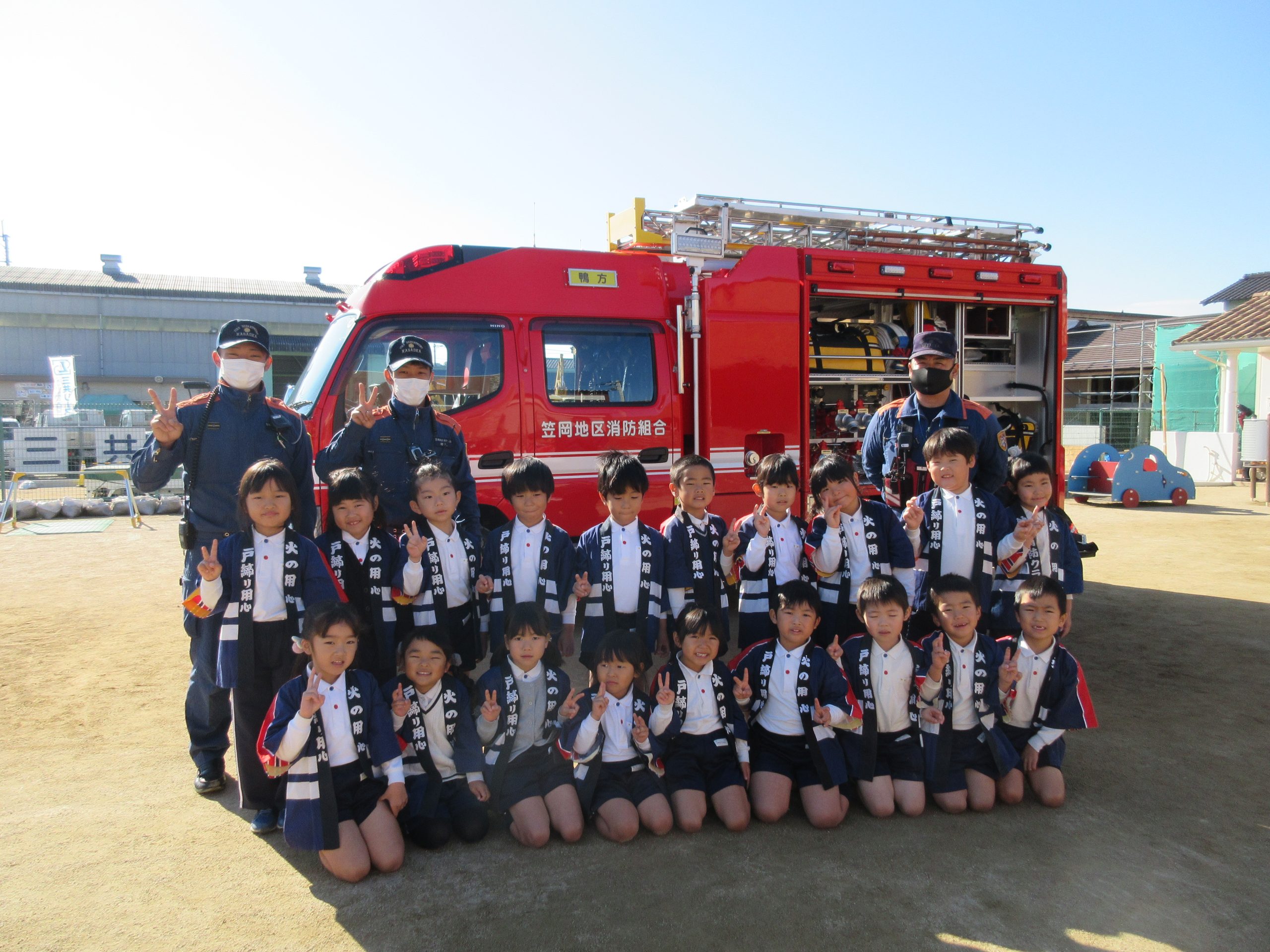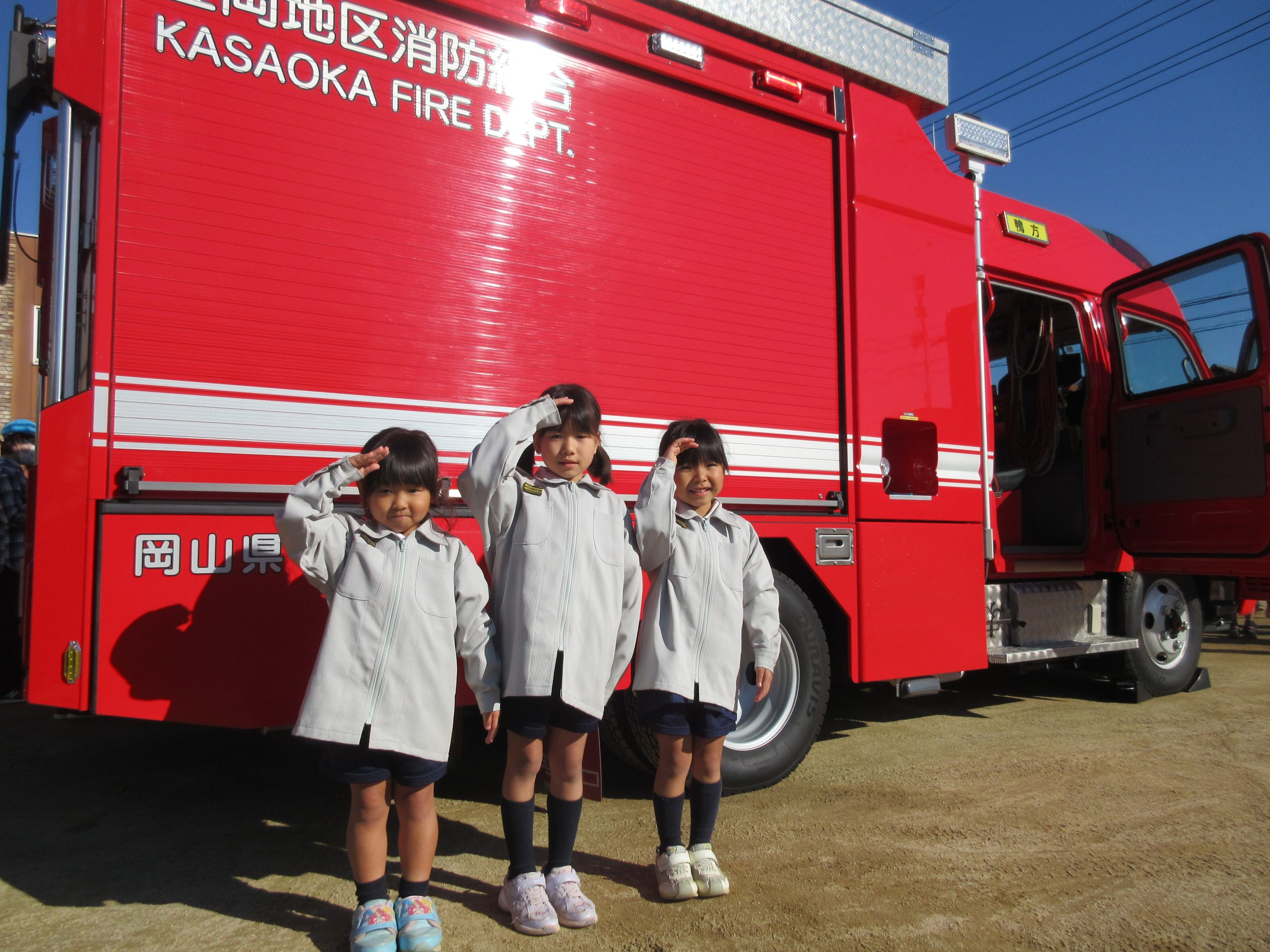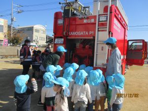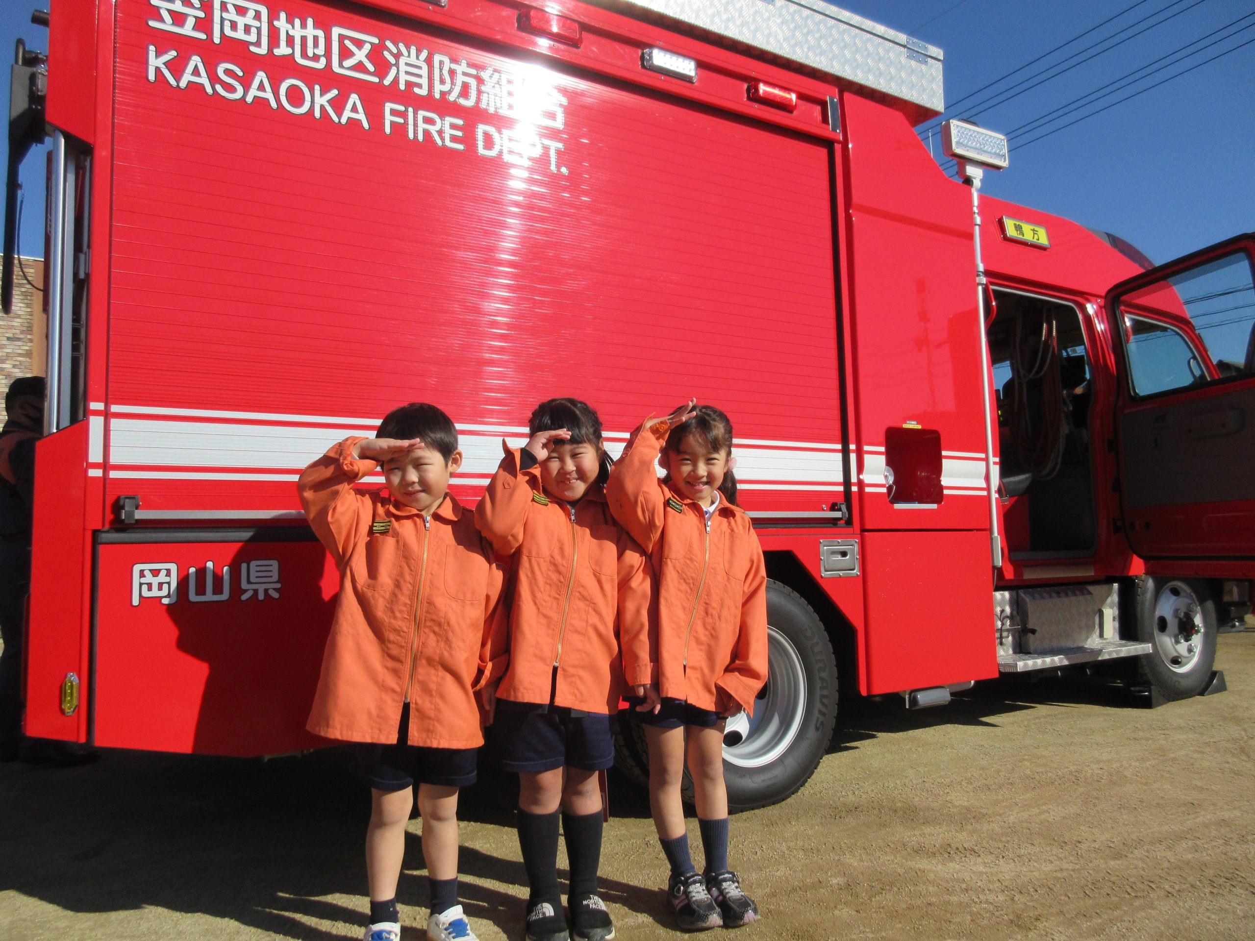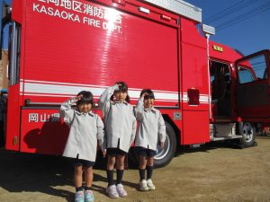 今日は、鴨方消防署の方に来ていただき、幼年消防クラブに参加しました。