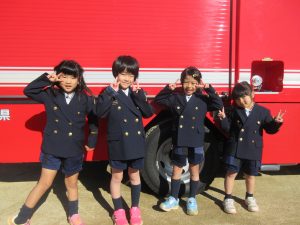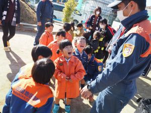 防火はっぴに着替えて、消防士さんと「防火の誓い」を言い、一緒に記念撮影をしました。