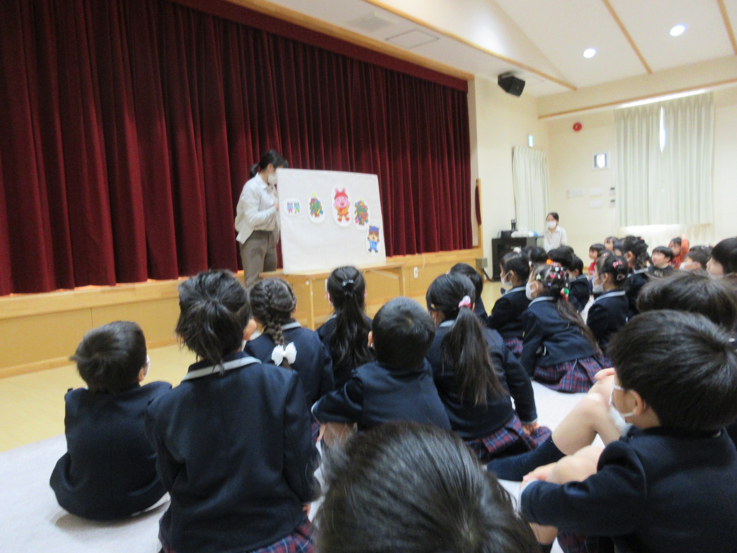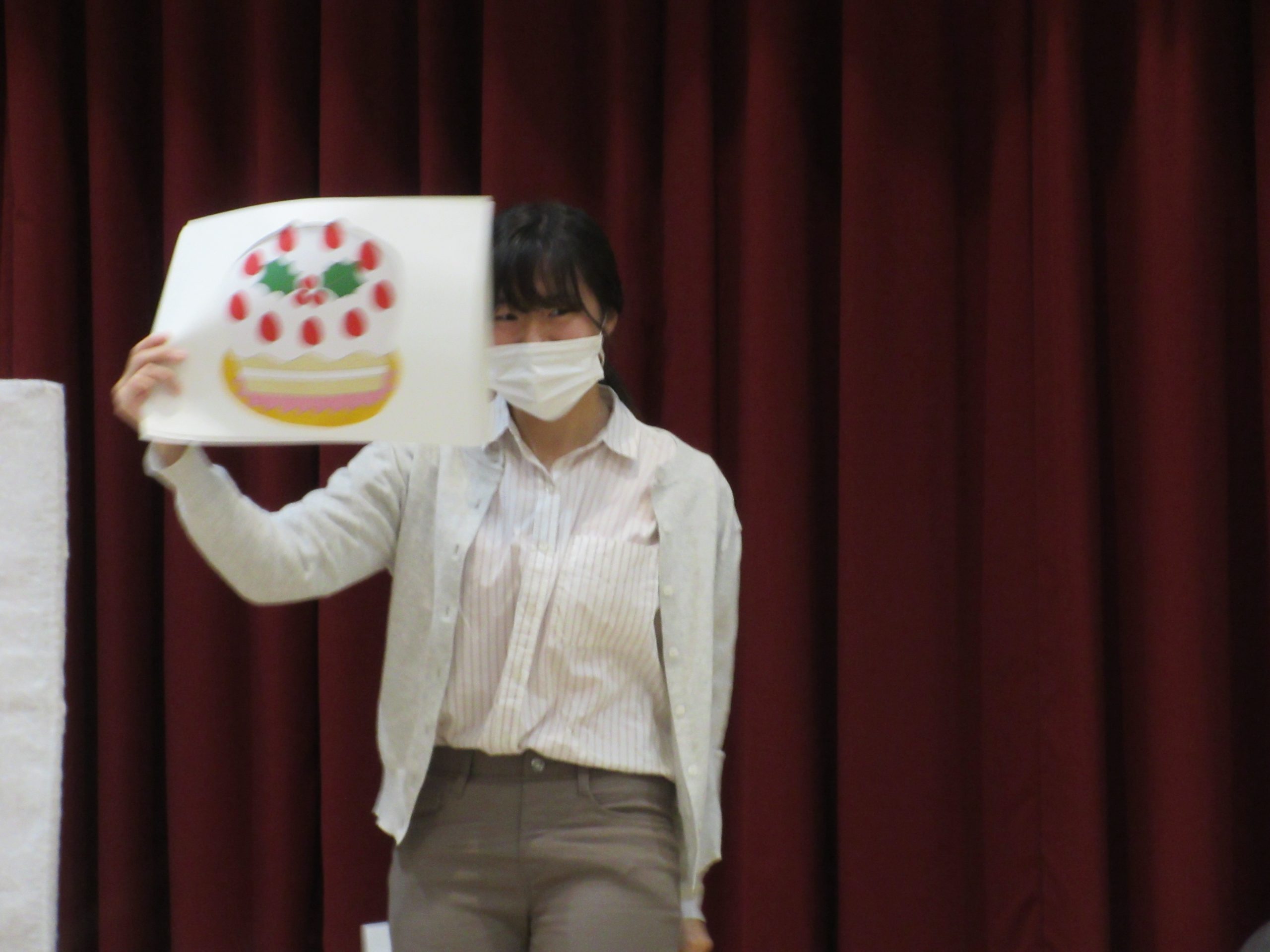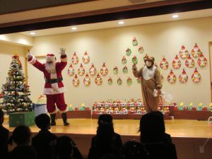 まず初めに先生からの出し物では、マジックシアター「サンタさんちちんぷいぷい」を見たり、「大きなもみの木、小さなもみの木」のお話を聞きました。