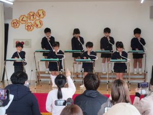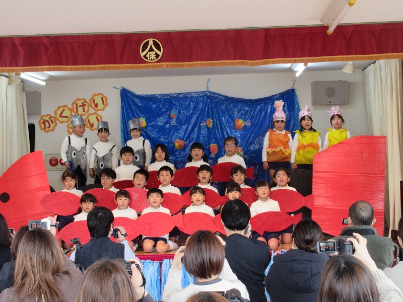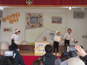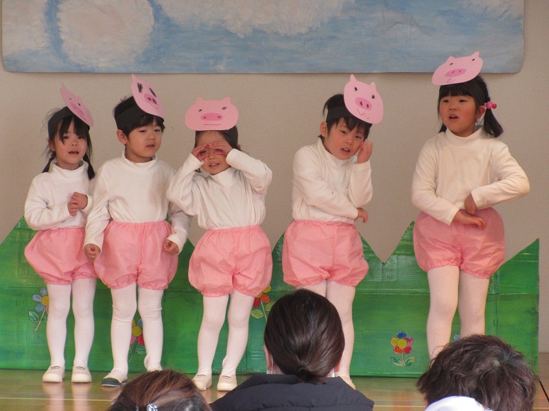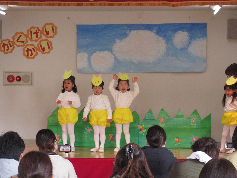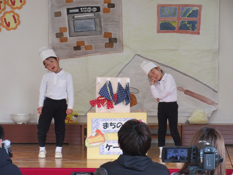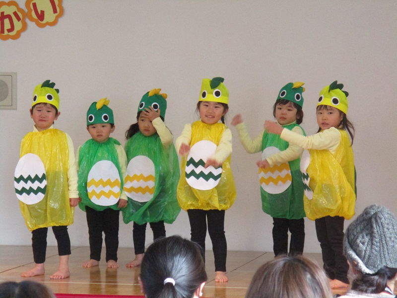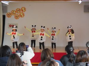 かわいい衣装を着てリズムダンス♪ 楽器演奏や劇のセリフも、おうちの方に見ていただいてとても上手でした。